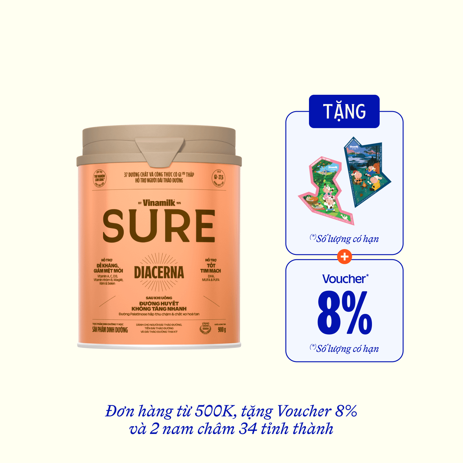 VINAMILK SURE DIACERNA với công thức GI (1) thấp (27,6), được thử nghiệm lâm sàng, giúp đường huyết không tăng nhanh sau khi uống, bổ sung 37 dưỡng chất hỗ trợ tăng cường sức khỏe.