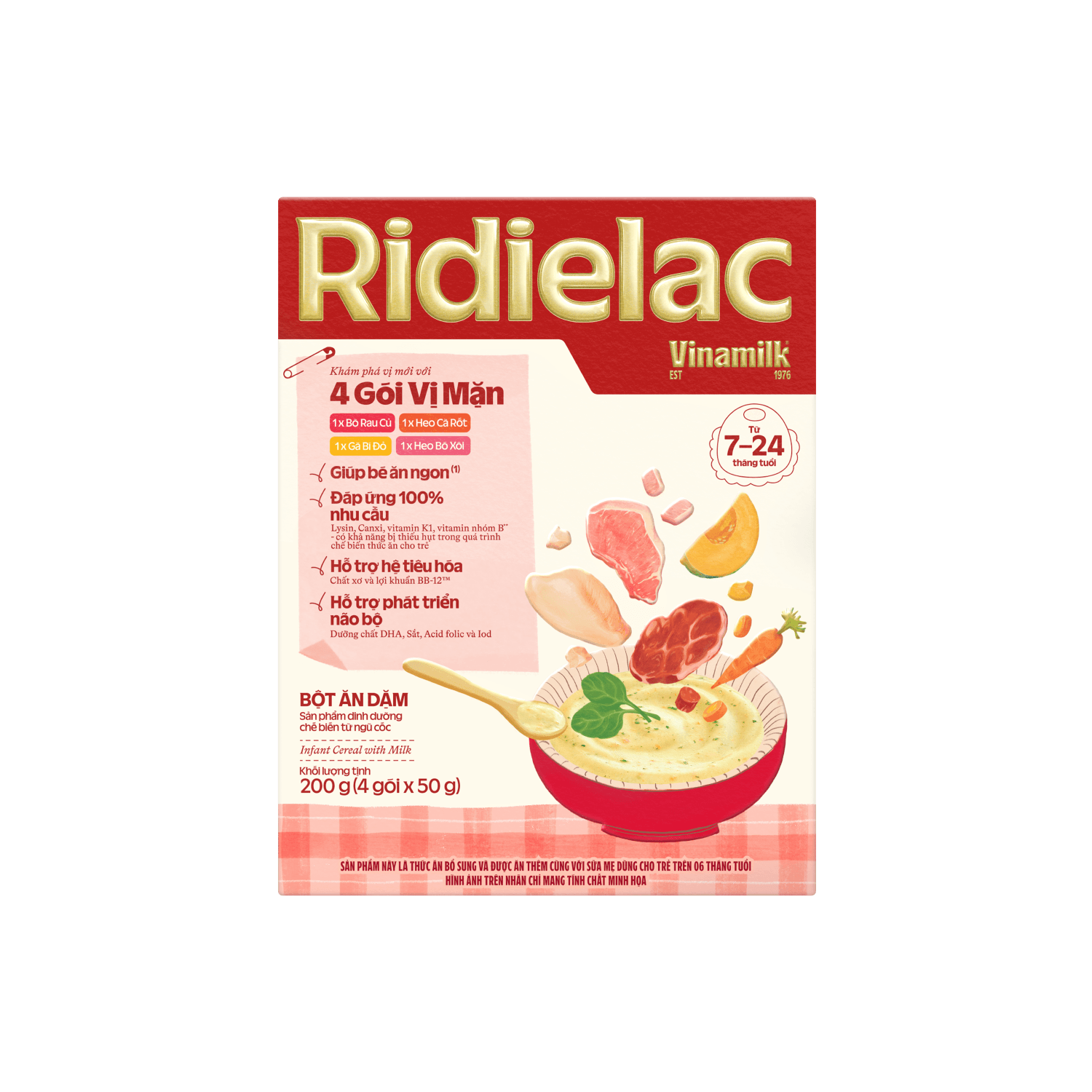 BÒ RAU CỦBột gạo, sữa bột, dầu thực vật, đường, ruốc thịt bò (thịt bò, muối) (6,5%), maltodextrin, bột rau củ (cà rốt, bó xôi, bí đỏ, hành lá) (4,9%), chất xơ hòa tan inulin, đạm whey, các khoáng chất (kali citrat, calci carbonat, tricalci phosphat, sắt pyrophosphat, kẽm sulfat, kali iodid), lysin, DHA từ dầu cá, các vitamin (natri ascorbat, niacin, E, calci D-pantothenat, B1, B6, B2, A, acid folic, K1, biotin, D3, B12), Bifidobacterium (BB-12™) (probiotics), lutein.GÀ BÍ ĐỎBột gạo, sữa bột, dầu thực vật, ruốc thịt gà (thịt gà, muối) (7,5%), đường, bột rau củ (cà rốt, bí đỏ (2%), hành lá) (5,55%), maltodextrin, chất xơ hòa tan inulin, đạm whey, các khoáng chất (kali citrat, calci carbonat, tricalci phosphat, sắt pyrophosphat, kẽm sulfat, kali iodid), lysin, DHA từ dầu cá, các vitamin (natri ascorbat, niacin, E, calci D-pantothenat, B1, B6, B2, A, acid folic, K1, biotin, D3, B12), Bifidobacterium (BB-12™) (probiotics), lutein.HEO CÀ RỐTBột gạo, sữa bột, dầu thực vật, maltodextrin, đường, bột rau củ (cà rốt (4,25%), hành lá), đạm chiết xuất từ heo (4%), ruốc thịt heo (3%), chất xơ hòa tan inulin, đạm whey, các khoáng chất (kali citrat, calci carbonat, tricalci phosphat, sắt pyrophosphat, kẽm sulfat, kali iodid), lysin, DHA từ dầu cá, các vitamin (natri ascorbat, niacin, E, calci D-pantothenat, B1, B6, B2, A, acid folic, K1, biotin, D3, B12), Bifidobacterium (BB-12™) (probiotics), lutein.HEO BÓ XÔIBột gạo, sữa bột, maltodextrin, dầu thực vật, đường, đạm chiết xuất từ heo (4%), bột rau củ (bó xôi (3,3%), hành lá), ruốc thịt heo (3%), đạm whey, chất xơ hòa tan inulin, các khoáng chất (calci carbonat, kali citrat, tricalci phosphat, sắt pyrophosphat, kẽm sulfat, kali iodid), lysin, DHA từ dầu cá, các vitamin (natri ascorbat, niacin, E, calci D-pantothenat, B1, B6, B2, A, acid folic, K1, biotin, D3, B12), Bifidobacterium (BB-12™) (probiotics), lutein.